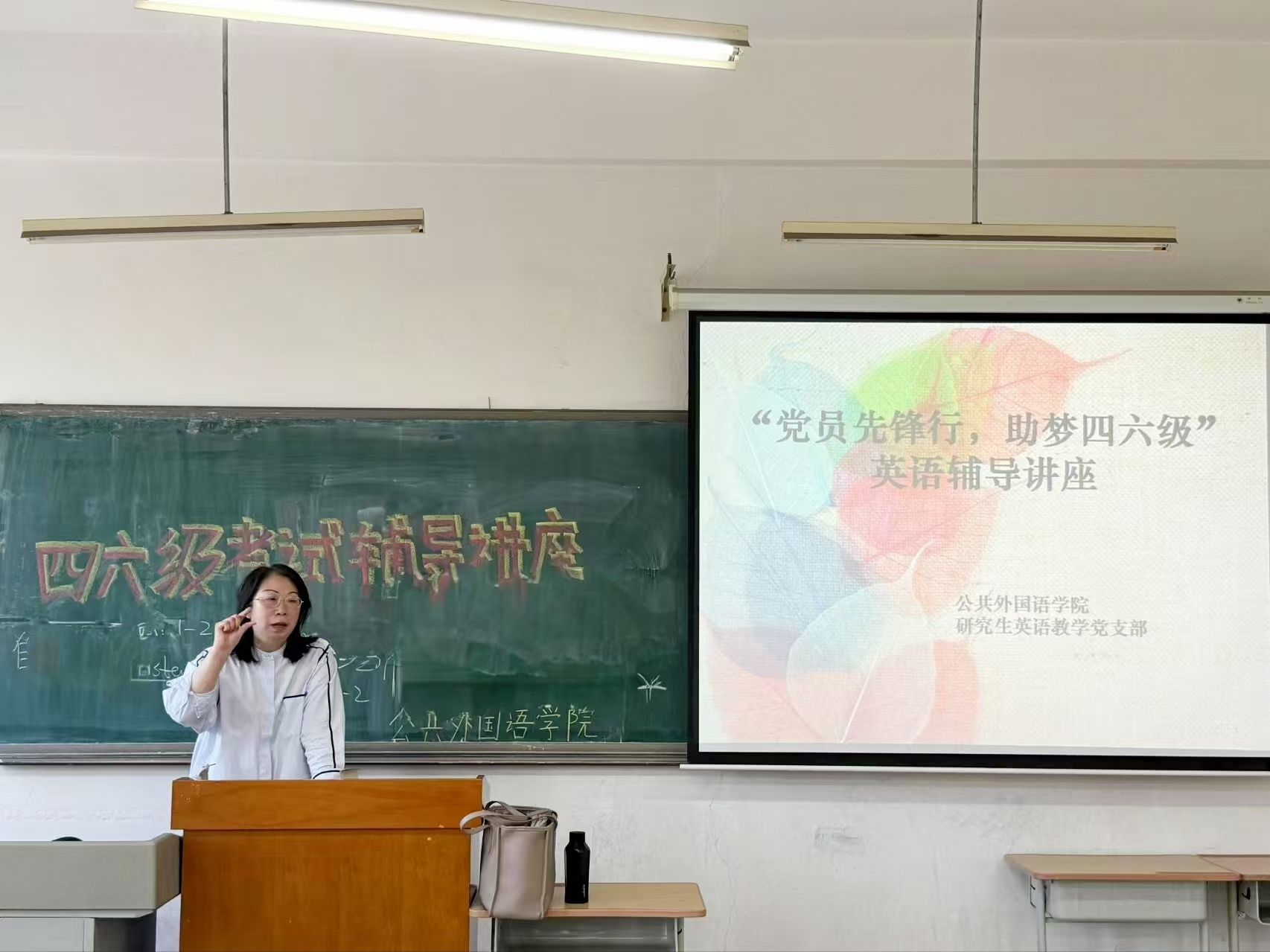 本次四六级考前英语讲座,为同学们提供了系统的备考指导和实用的学习方法,有助于同学们更有针对性地进行复习,为即将到来的四六级考试做好充分准备。通过“党员先锋行 四六级筑梦成”系列讲座活动的开展,党员教师充分发挥模范带头作用,深入到员工中去,为员工四六级保驾护航。