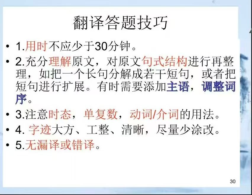 在写作部分,赵老师明确评分三大维度:切题、表达通顺、语言水平。她指出,通过主动运用高级词汇和复杂句型,可突破基础线,冲刺高分。翻译模块则需兼顾“忠实原文”与“英语表达习惯”,建议分配足够多的时间作答。